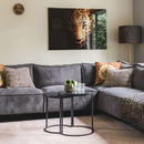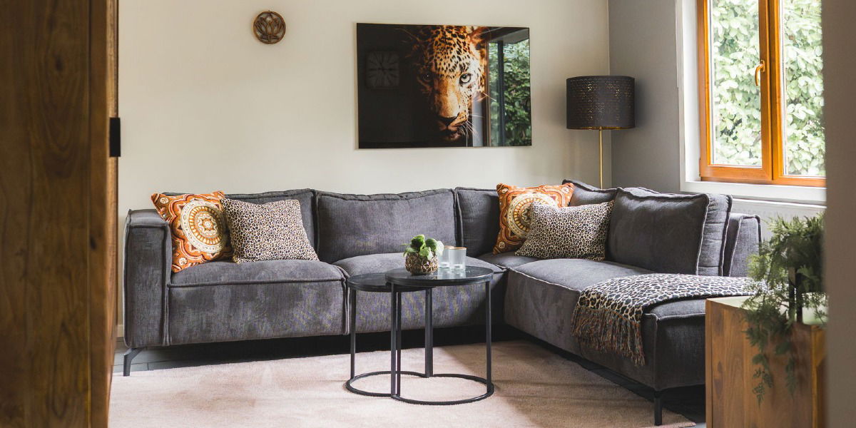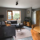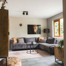 De woonkamer vormt het hart van het boshuisje, met twee comfortabele hoekbank om samen neer te ploffen na een dag buiten of een moment in de sauna of hottub.