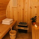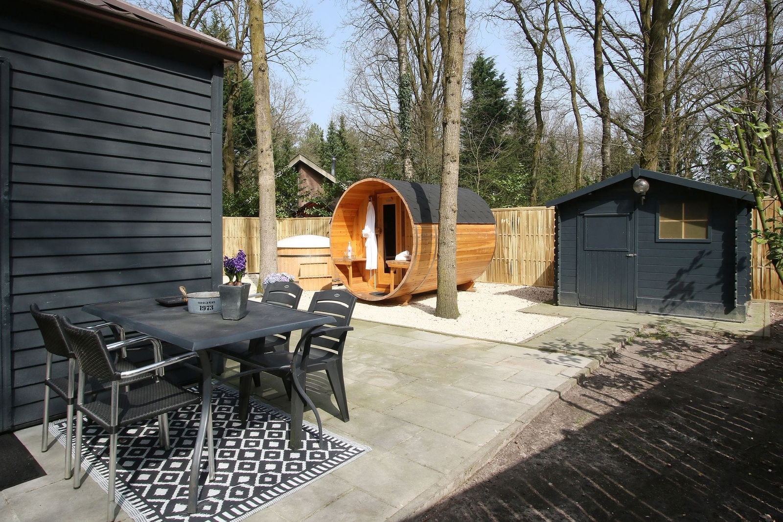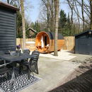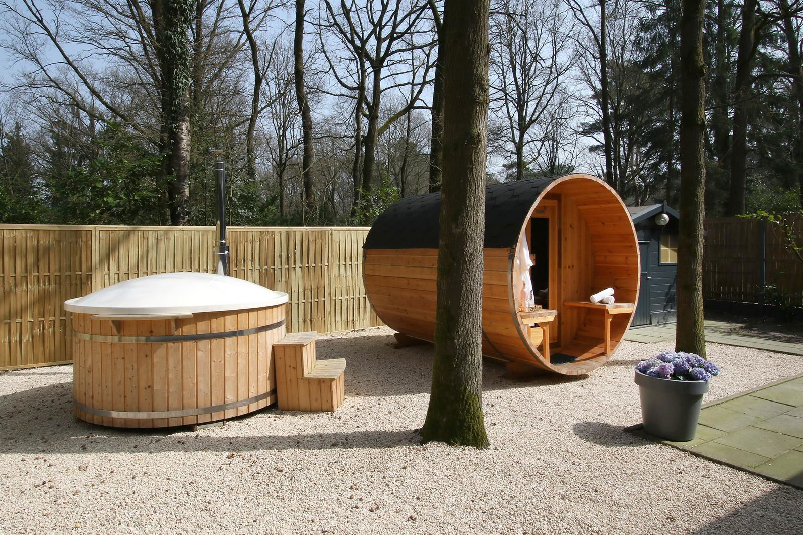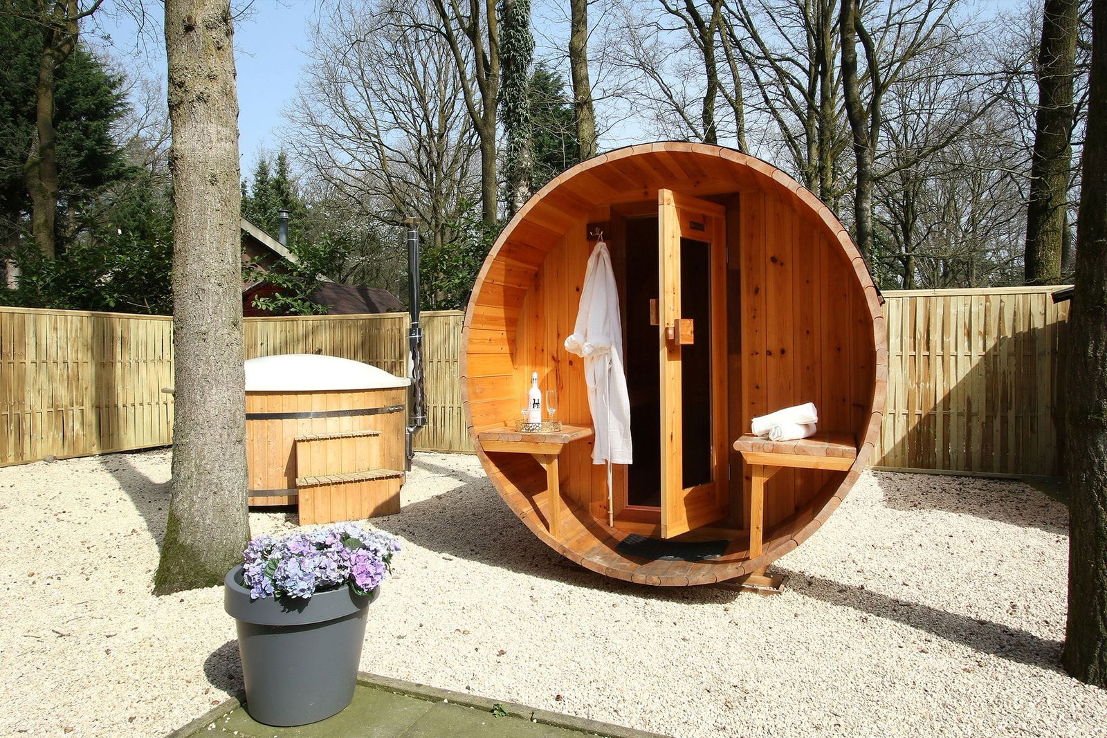 • Barrelsauna Naast de hottub staat een volledig afgeschermde barrelsauna, exclusief voor jullie. Bij aankomst ligt er etherische olie klaar voor een sauna-opgieting. Je gebruikt de sauna zo vaak en wanneer je wilt.