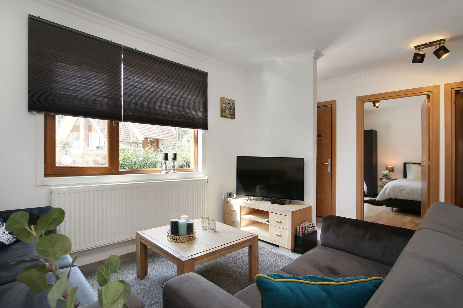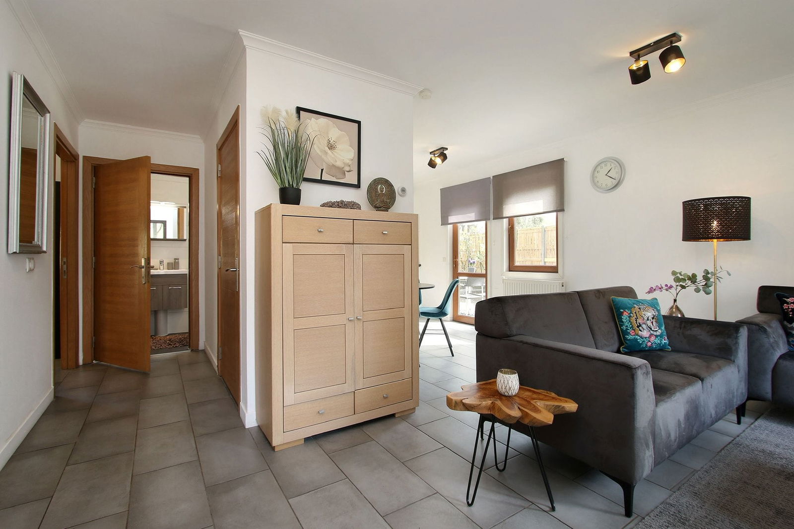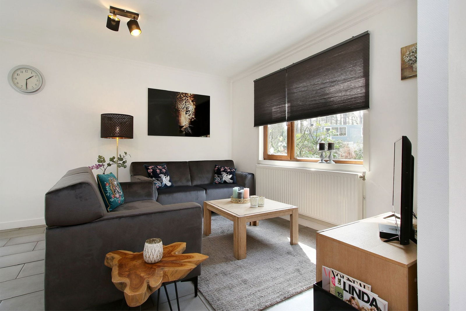 De woonkamer is ingericht met twee comfortabele banken en vormt het hart van het huisje. Een fijne plek om samen te ontspannen na een boswandeling of een wellness moment. Er is wifi en een tv aanwezig, maar veel gasten gebruiken de ruimte vooral om te lezen, spelletjes te doen of gewoon tot rust te komen.