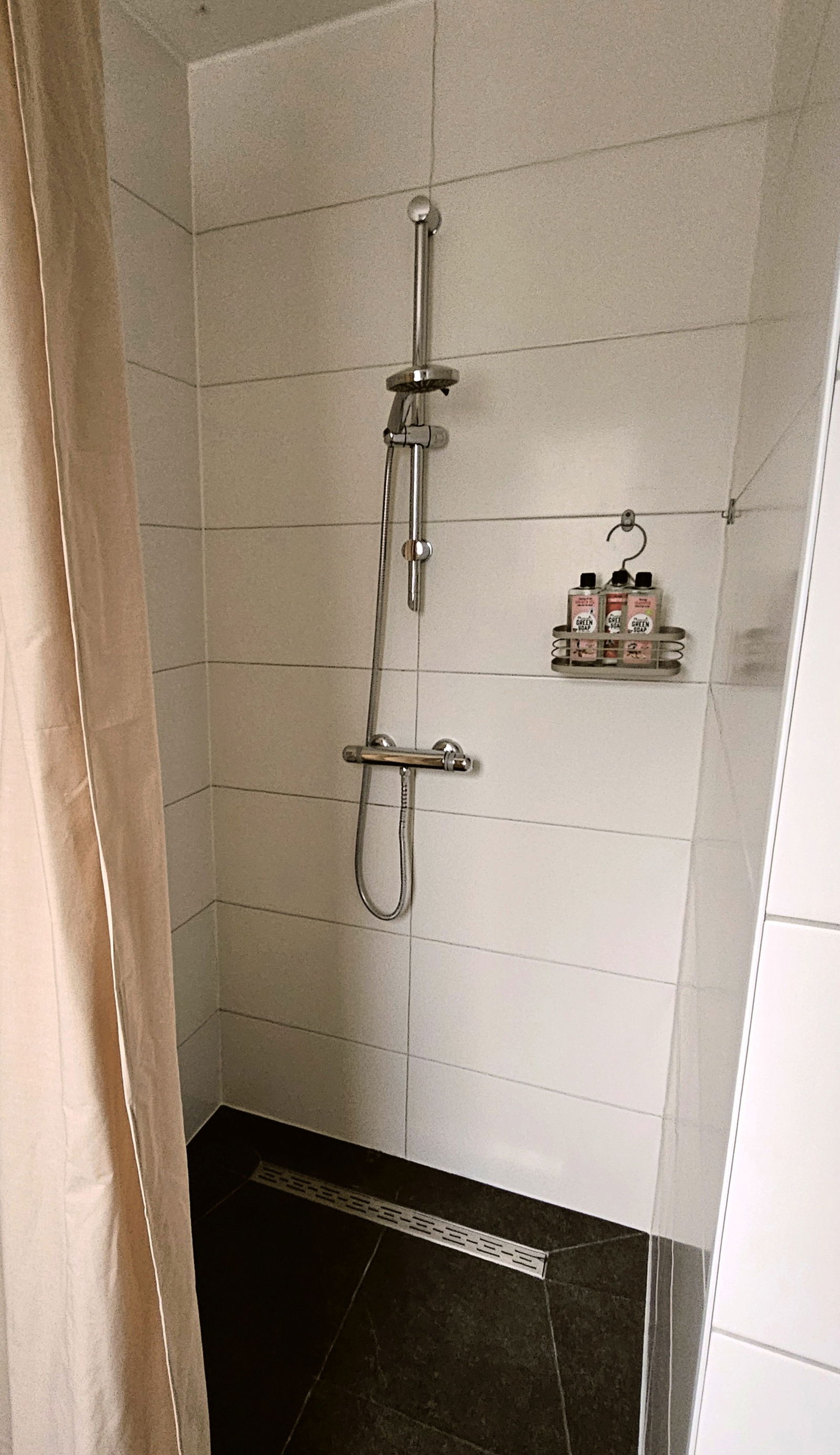 De badkamer is netjes en praktisch ingericht met een fijne douche en wastafel.