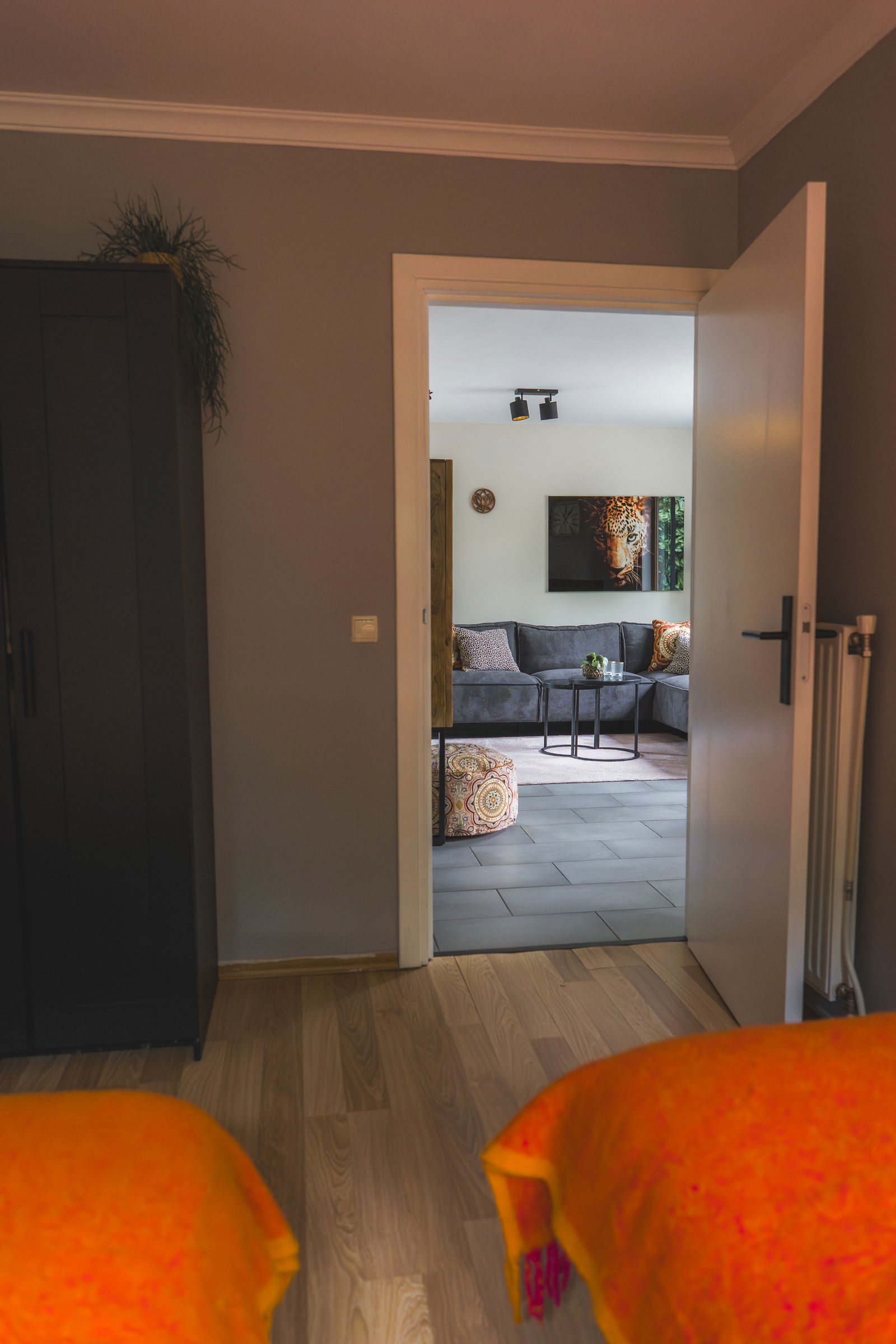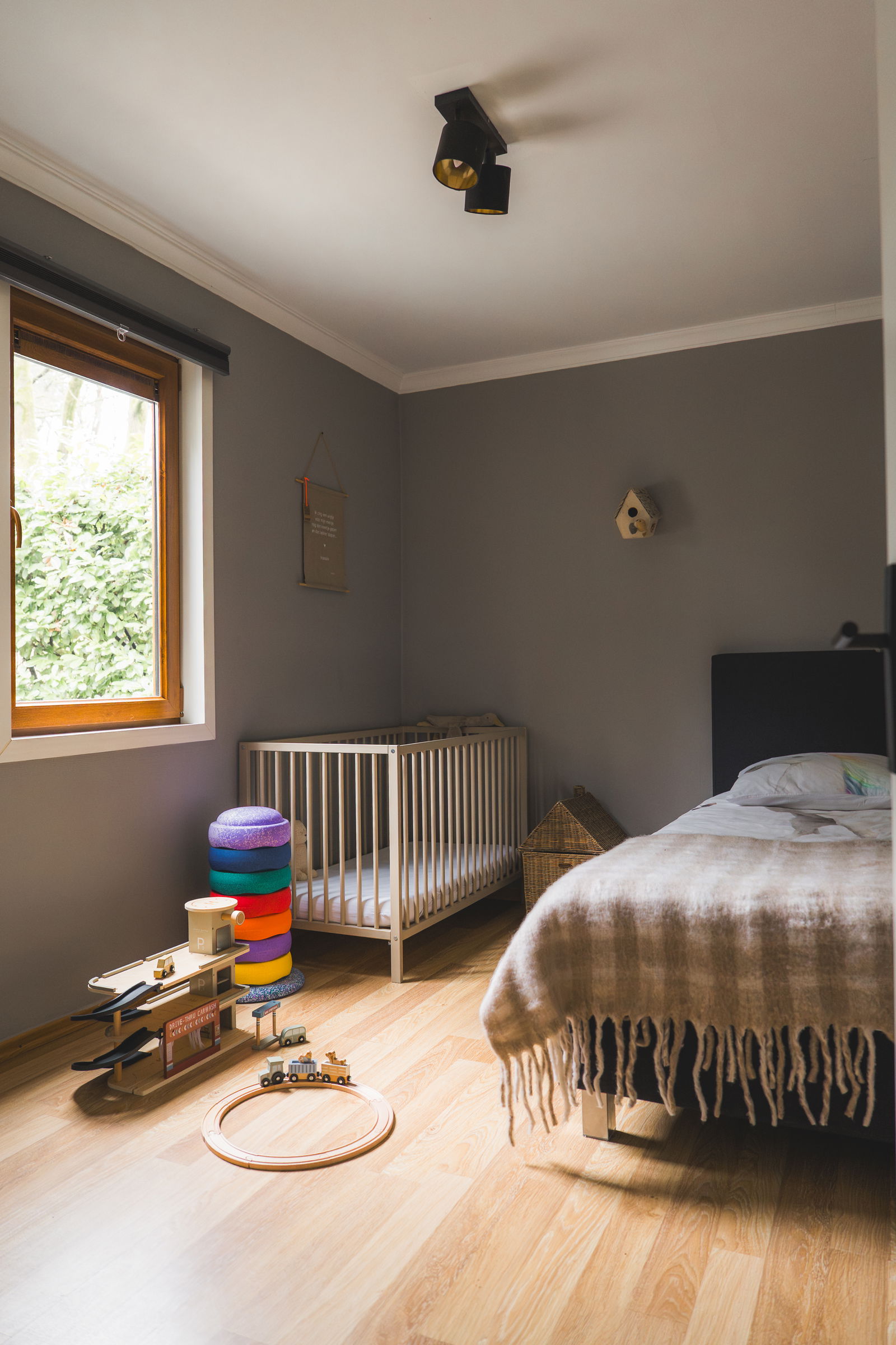 • Daarnaast is er een kinderkamer met een eenpersoonsbed, ledikant en een rustig hoekje met yogamat en kussen.